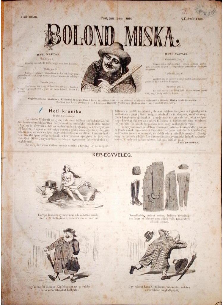 075 000 Ft1868. január 5-én jelent meg a legnépszerűbb dualizmuskori élclap, a Borsszem Jankó első száma, mely Ágai Adolf főszerkesztő gondozásában került az olvasókhoz. Művészi igényű karikatúráival, szatirikus írásaival a Borsszem Jankó fennállása első fél évszázadában több mint kétezer fős olvasótábort toborzott magának, csökkenő népszerűséggel pedig egészen az 1938-as esztendőig fennmaradt.