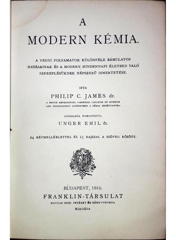 A kémia tudományában a német nemzet vezet, a vegyészeti ipar Németország «nemzeti ipara». Nem utolsó sorban ezeknek a tényeknek köszönheti e hatalmas nemzet nagyságát, erejét a népek versenyében, békében és háborúban egyaránt. Talán éppen ezért irta angol ember a modern kémiáról a legvonzóbb könyvet a művelt nagyközönség számára; hogy érdeklődést ébreszszen honfitársai széles körében e tudomány iránt, fájdalmasan tapasztalván, hogy az angol vegyészeti gyáriparosok kényelmes maradisága elragadni engedte az elsőség pálmáját nemzetétől, melynek fiai között pedig számos halhatatlan név akad a kémia tudománya és a vegyi-ipar megalapozói sorában. A mesélve-tanítás művészetével megirt munka magyar fordítását igyekeztem úgy megalkotni, hogy belőle semmi el ne veszszen, s az Ismeretterjesztő Könyvtár eddigi köteteihez méltó legyen. Budapest, 1915. évi augusztus havában. Dr. Unger Emil.