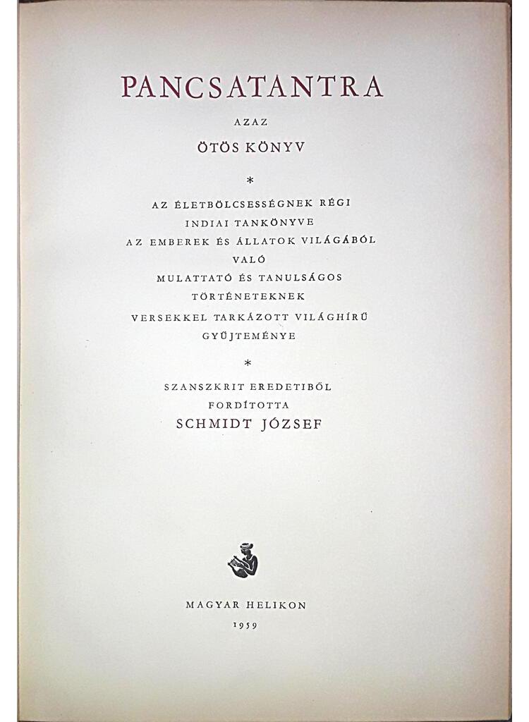 Ez az először 1924-ben, a Gyomai Kner Nyomda által megjelentetett könyv a Pancsatantra néven ismert világhírű ind mese- és regegyűjteménynek, éspedig az F. Kielhorn kiadta „egyszerűbb” szövegnek (Bombay Sanskrit Series No. IV. 1896.) első, s egyetlen magyar fordítása a szanszkrit eredetiből. Az embernek s tudósnak egyaránt kiváló Schmidt József emlékének is adózunk, amikor most Harmatta János professzor értékes előszavával és jegyzeteivel ellátva, újra a magyar olvasóközönség elé bocsátjuk.