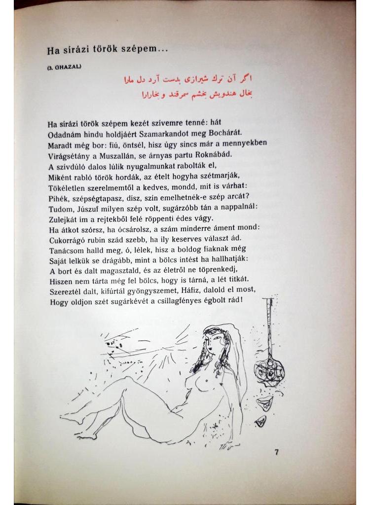 Immáron közel hét évszázada csengnek változatlan frissességgel és gazdag zengéssel a XIV. századi perzsa költő, Háfiz dalai, a ghazalok. De talán magyar nyelven először ily tisztán, maradéktalanul, mint ahogyan most Kepes Géza az eredeti perzsa nyelvből, a költőtárs szeretetével átültette őket. Szerelem, bor, emberség, barátság Háfiz ghazaljainak „örök témái”, de belülről idehallik a régesrégen élt irániak színes és idegen, mégis annyira ismerős, küzdelmes élete; a valósággal birkózó s az életben gyönyörködő ember világa. A kötet illusztrációit Kondor Lajos grafikusművész készítette, a maga eszközeivel ő is hozzájárulván a könyv olvasójának igaz, mély élvezetéhez.